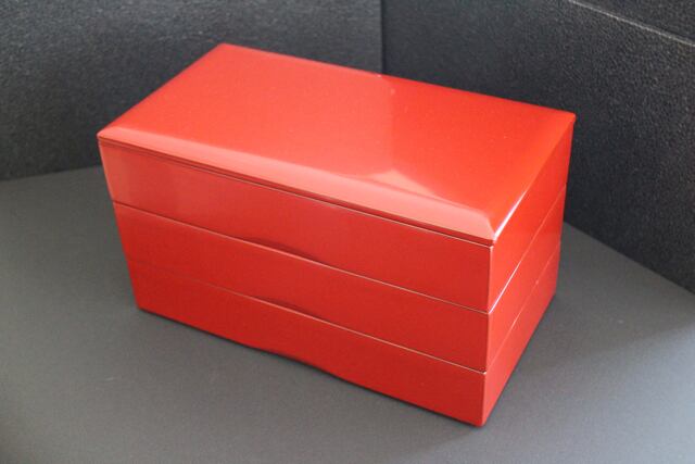 長方形の三段の重箱です。普段にも盛りつけて楽しめます。色は黒もございます。寸法L28xW15xH16(センチ)