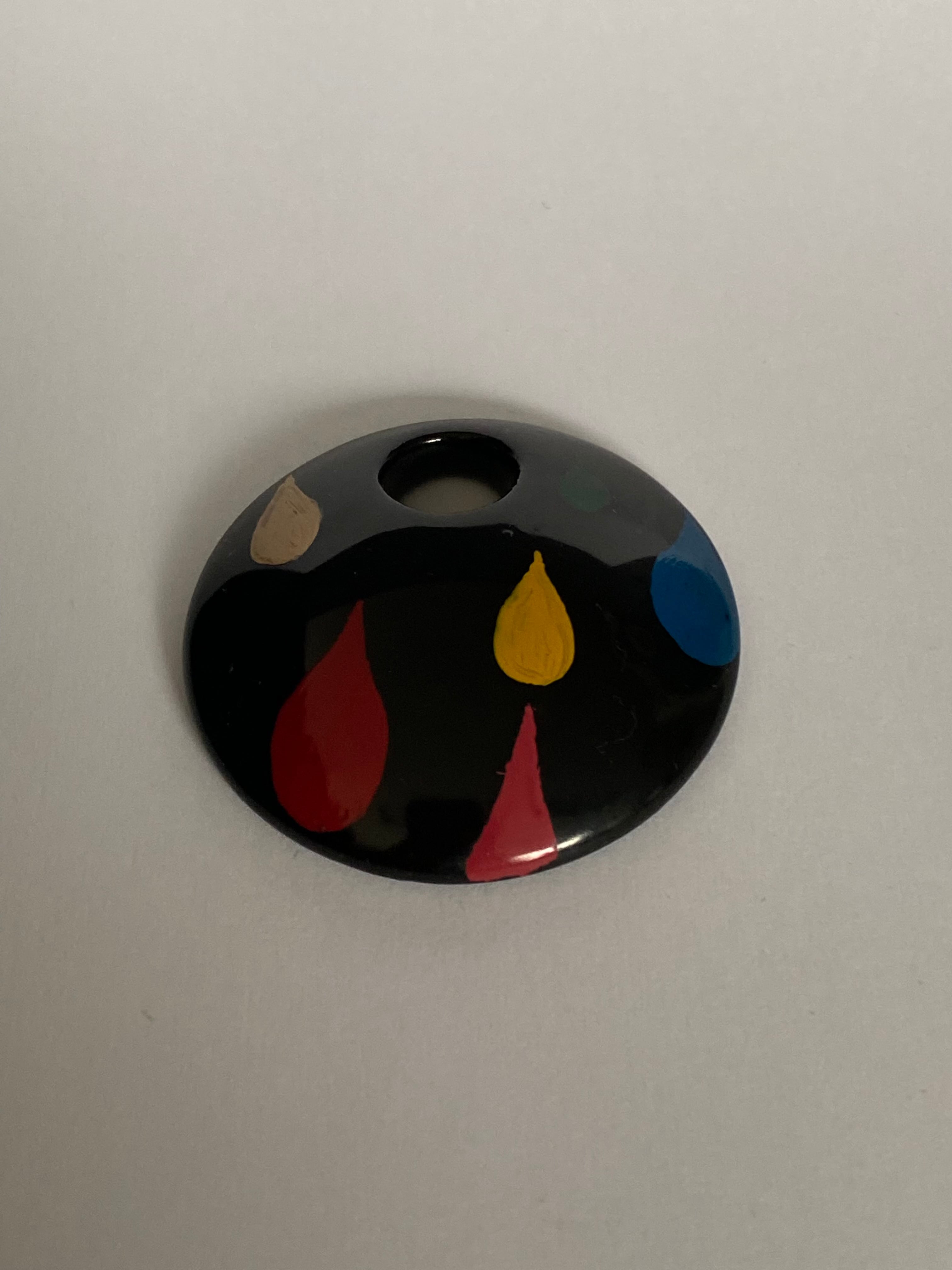 直径5㎝の朴の木地にうるしを塗ったブローチです