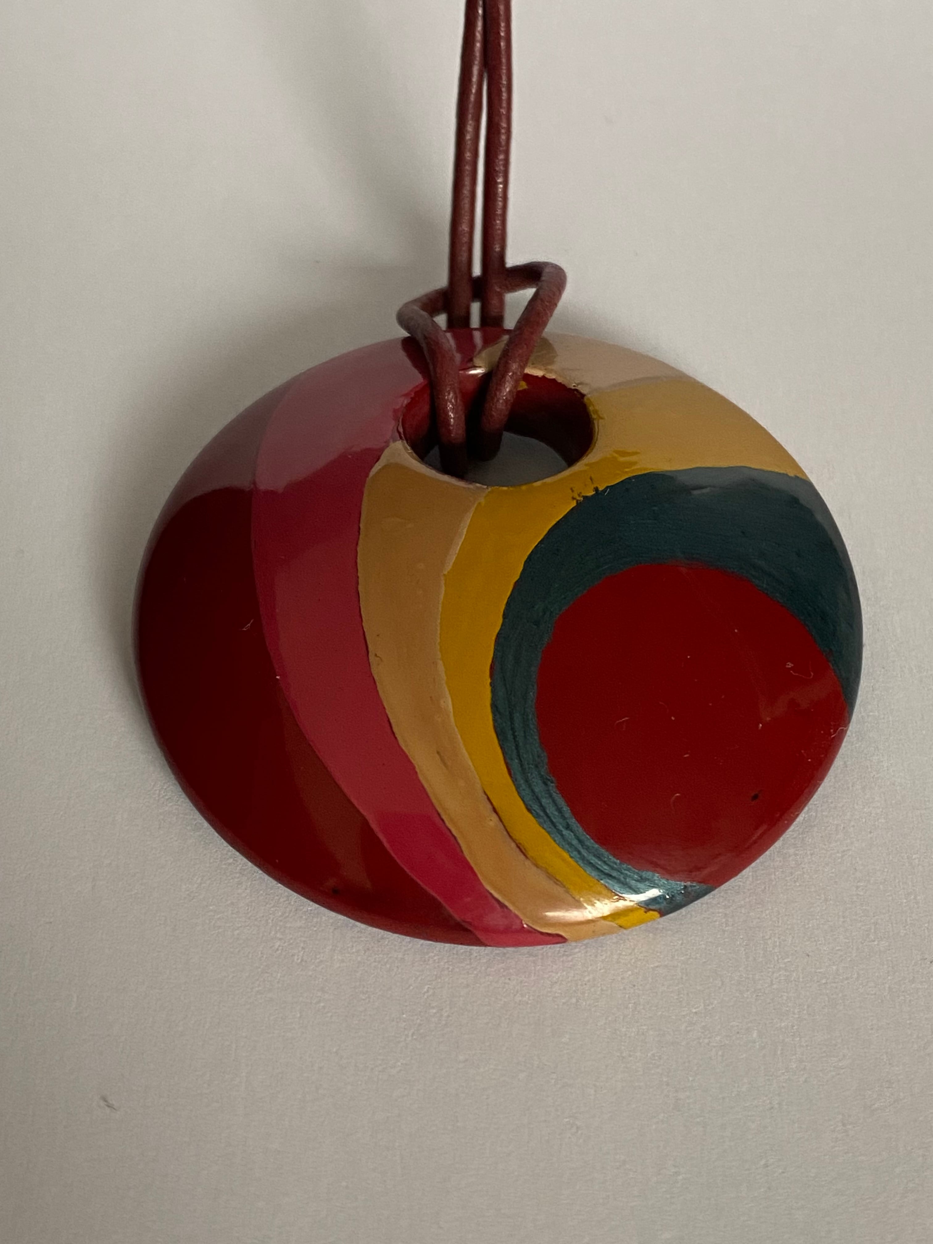 直径5㎝の朴の木地にうるしを塗ったブローチです